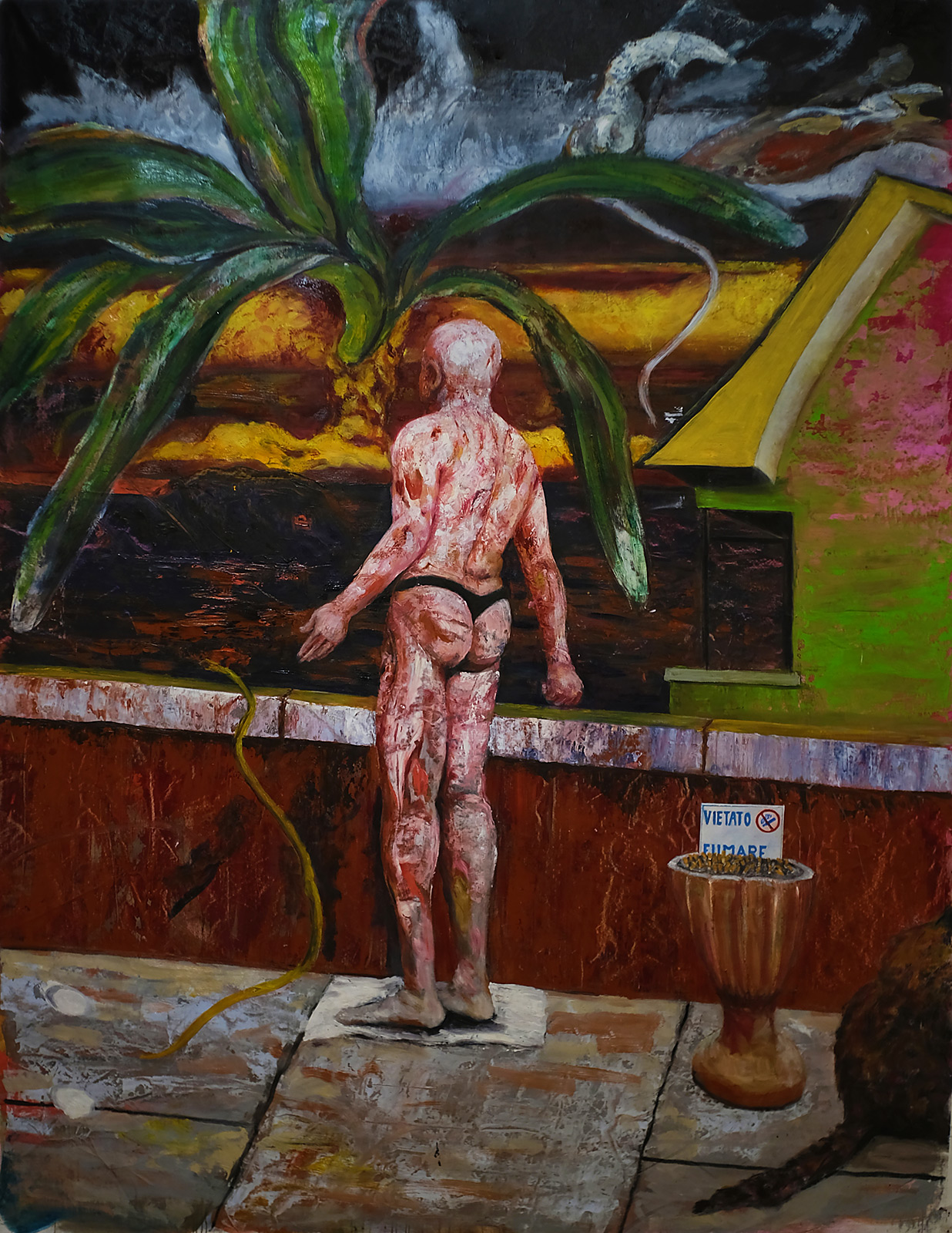 Elidon Mucaj bravely tackles the theme of human fragility, bringing to the canvas a naked, curled figure immersed in a natural setting that is as lush as it is alien. The body, bent and vulnerable, is rendered in muted tones and with expressive brushstrokes, while the background bursts with vegetation and vivid colours. The oil is applied thickly, creating a living materiality that reinforces the contrast between the energy of nature and the inertia of man. The large prickly pear cactus (Opuntia), a symbol of resistance and survival, towers over a body that seems about to dissolve. In this way the artist constructs a visual drama without rhetoric: the body is there, real, exposed and without defence. There is no judgement or pity, only observation. Elidon conveys the struggle of existence, the isolation, but also the possibility of rebirth through confrontation with the earth. The work becomes a visual meditation on abandonment and resilience.